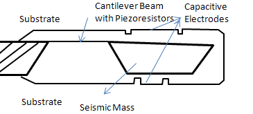 在MEMS加速度傳感器中,敏感元件是差分電容器的梳狀結(jié)構(gòu),該電容器并聯(lián)布置在由從硅襯底蝕刻的彈簧支撐的梁(形成地震質(zhì)量)上。差分電容器形成由高頻方波發(fā)生器驅(qū)動的電容性半橋。當(dāng)垂直于地震質(zhì)量施加加速度時,差分電容器不匹配,并且中心板上出現(xiàn)非零電壓。該信號被預(yù)放大,解調(diào),放大并作為與施加的加速度成比例的電壓輸出。