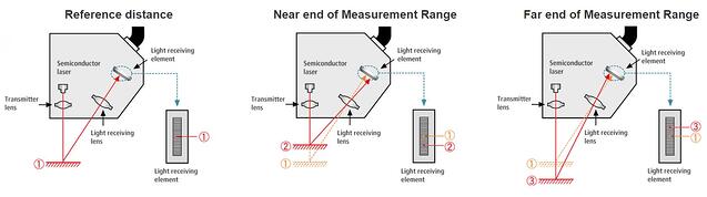 激光位移傳感器將三角測(cè)量與發(fā)射和接收透鏡配合使用。激光束通過(guò)透射透鏡射向目標(biāo)。然后,光反射回傳感器,并由接收器透鏡導(dǎo)向接收元件。隨著目標(biāo)越來(lái)越近,反射光的角度也會(huì)發(fā)生變化(聚焦在接收元件上的不同位置)。在防止使用加速度計(jì)(例如旋轉(zhuǎn)部件)的應(yīng)用中,或者在加速度計(jì)的質(zhì)量會(huì)對(duì)系統(tǒng)的運(yùn)動(dòng)產(chǎn)生太大影響時(shí),最好使用位移傳感器。