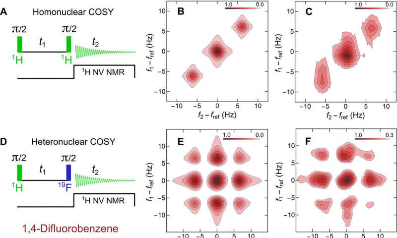 DFB的2D COZY NMR。(A)同核COZY脈沖序列,(B)模擬光譜,以及(C)DFB的實驗NV NMR光譜。(D)在(E)模擬和(F)實驗中,修飾的異核COZY序列均顯示非對角峰。色標(biāo)對應(yīng)于2D傅立葉變換的歸一化絕對值。垂直軸(f1-fref)對應(yīng)于t1維度的頻率,而水平軸(f2-fref)對應(yīng)于t2維度的頻率。在(C)中,使用了t1的14個值,以0.021-s的增量遞增,直到0.294 s?偛杉瘯r間為22小時。在(F)中,使用了t1的16個值,以0.021-s的增量遞增,直到0.336 s?偛杉瘯r間為25小時。在這兩種情況下,t2采集的時間從0到1.25 s。所有模擬都是使用SPINACH軟件包執(zhí)行的。模擬和實驗數(shù)據(jù)使用相同的窗口功能。圖片來源:Science Advances,doi:10.1126 / sciadv.aaw7895。