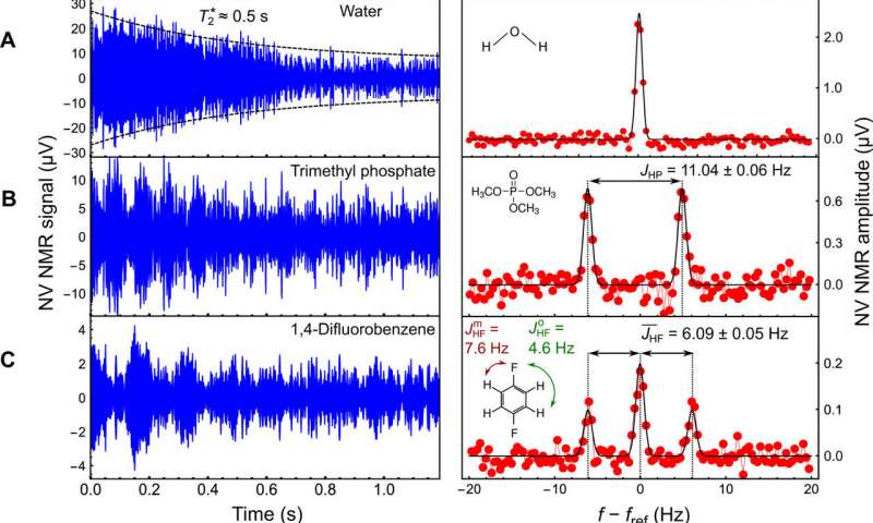 1D NMR。(A)水,(B)磷酸三甲酯(TMP)和(C)1,4-二氟苯(DFB)的時域(左)和頻域(右)NV NMR信號。信號在約103條跡線上取平均,總采集時間約1小時。在時域數(shù)據(jù)上使用?1 kHz帶寬的帶通濾波器,以實現(xiàn)更好的可視化。頻域頻譜顯示了傅里葉變換的虛部。每個光譜都適合高斯函數(shù)(黑線)。對于TMP,我們將兩條線的寬度限制為1:1的振幅比,并得出JHP = 11.04±0.06 Hz。對于DFB,我們將所有三條線的寬度限制為等于1:2:1的振幅比,并得出JHF = 6.09±0.05 Hz。圖片來源:Science Advances,doi:10.1126 / sciadv.aaw7895。