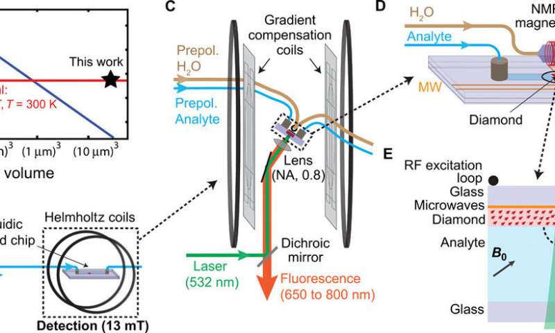 微流體預(yù)極化NMR設(shè)置。(A)比較水中質(zhì)子的統(tǒng)計極化和熱極化與檢測量的關(guān)系。室溫水質(zhì)子密度為ρ= 6.7×1028 m-3。(B)預(yù)極化概念。通過使分析物流過永磁體(1.5-T Halbach陣列)使電極預(yù)極化。隨后將其穿梭到容納在穩(wěn)定的較低磁場(B0 = 13 mT,亥姆霍茲線圈)中的微流控芯片中,并通過NV NMR對其進行檢測。(C)檢測設(shè)置。預(yù)極化的分析物流到微流體芯片,在這里它通過流體開關(guān)(未顯示)停止,并使用定制的落射熒光顯微鏡(數(shù)值孔徑(NA)約為0.8)檢測NV NMR信號。一組八個梯度補償線圈用于消除沿磁場方向的一階和二階磁場梯度。使用基于線圈的NMR磁力計和纏繞在主亥姆霍茲線圈上的低電感反饋線圈,可以暫時穩(wěn)定磁場。(D)微流體芯片設(shè)置。該芯片是使用玻璃和粘合劑構(gòu)建的。兩條流體管線通向檢測區(qū)域,一條流體由水組成(用于NMR線圈磁力計),另一條流體與分析物組成(用于NV NMR)。放置在NMR線圈磁力計和NV NMR傳感器之間的射頻(RF)激勵回路可激發(fā)兩個通道中的核自旋相干。NMR線圈磁力計由3毫米直徑的線圈組成,該線圈纏繞在約10微升的水量中。將射頻激勵回路和NMR線圈磁力計彼此正交放置,以最大程度地減少串?dāng)_。印刷在玻璃芯片內(nèi)部的銅微波(MW)線可對NV電子自旋進行自旋控制。(E)NV NMR幾何形狀。NV摻雜的金剛石膜(1毫米乘1毫米乘0.035毫米)位于與分析物接觸的微流體通道(寬度:2毫米,高度:0.2毫米至1毫米)的表面上。激光照射(532 nm)從印刷的微波線上反射,并檢測到熒光(650至800 nm)。有效的分析物檢測量約為40 pL。圖片來源:Science Advances,doi:10.1126 / sciadv.aaw7895 NV摻雜的金剛石膜(1毫米乘1毫米乘0.035毫米)位于與分析物接觸的微流體通道(寬度:2毫米,高度:0.2毫米至1毫米)的表面上。激光照射(532 nm)從印刷的微波線上反射,并檢測到熒光(650至800 nm)。有效的分析物檢測量約為40 pL。圖片來源:Science Advances,doi:10.1126 / sciadv.aaw7895 NV摻雜的金剛石膜(1毫米乘1毫米乘0.035毫米)位于與分析物接觸的微流體通道(寬度:2毫米,高度:0.2毫米至1毫米)的表面上。激光照射(532 nm)從印刷的微波線上反射,并檢測到熒光(650至800 nm)。有效的分析物檢測量約為40 pL。圖片來源:Science Advances,doi:10.1126 / sciadv.aaw7895