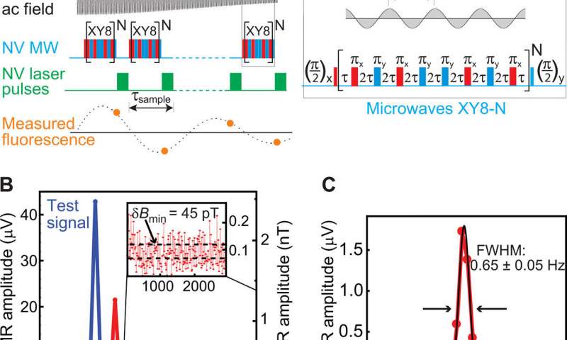 預(yù)極化的NV NMR的表征。(A)同步讀出脈沖序列。它由一系列XY8-N脈沖組成,這些脈沖對由處理核產(chǎn)生的交流磁場進行連續(xù)的相位測量。測得的熒光反映了核交流場投影的混疊形式。每2.5到4.25 s(流動1.25 s,其余用于檢測)重復(fù)整個序列。(B)水(紅色)和施加的2.5nT振幅測試場(藍色)的NV NMR光譜(傅里葉變換的絕對值),有效采集時間為5.2 s(平均60條跡線;總測量時間為150 s) )。從處理后的光電探測器信號獲得的NMR信號幅度以μV記錄。磁場幅度的轉(zhuǎn)換(以nT為單位)是從校準(zhǔn)的測試場得出的。插圖:本底噪聲的SD顯示aBmin = 45 pT。根據(jù)這些數(shù)據(jù),我們推斷出最低可檢測濃度為27 M s1 / 2(SNR = 3)。加上所有的實驗死區(qū)時間,濃度靈敏度約為45 M s1 / 2。(C)水的高分辨率NV NMR光譜(傅里葉變換的虛部)顯示半峰全寬(FWHM)的線寬為0.65±0.05 Hz。通過平均60條跡線(每條3 s長)獲得數(shù)據(jù)。圖片來源:Science Advances,doi:10.1126 / sciadv.aaw7895 65±0.05赫茲。通過平均60條跡線(每條3 s長)獲得數(shù)據(jù)。圖片來源:Science Advances,doi:10.1126 / sciadv.aaw7895 65±0.05赫茲。通過平均60條跡線(每條3 s長)獲得數(shù)據(jù)。圖片來源:Science Advances,doi:10.1126 / sciadv.aaw7895
