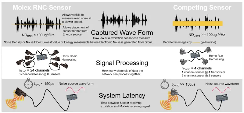 EV的優(yōu)點(diǎn)之一是靜音推進(jìn),但從設(shè)計(jì)和用戶角度出發(fā),權(quán)衡是道路噪音問題。Molex表示,其新傳感器與ADI網(wǎng)絡(luò)技術(shù)一起可通過縮短聲波消除時(shí)間并減輕布線重量來幫助改善RNC。