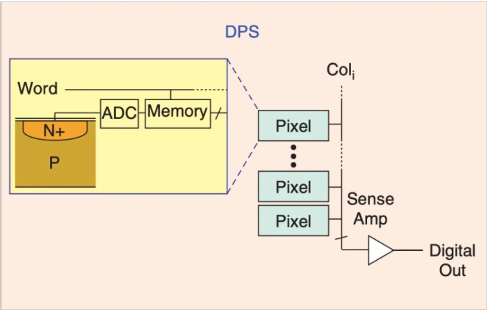 上圖顯示了APS(有源像素傳感器)架構。在APS設備中,每個像素位置不僅包含光電二極管,而且包含放大器。一種稱為PPS(無源像素傳感器)的更簡單的體系結構沒有將放大器集成到像素中。在DPS(數(shù)字像素傳感器)設備中,每個像素都有自己的模數(shù)轉換器和存儲塊。因此,DPS體系結構中的像素輸出與光強度成比例的數(shù)字值。
