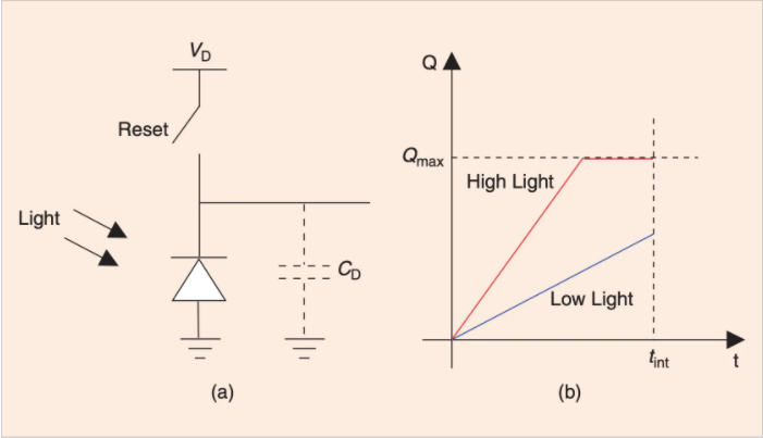 重置開關在曝光周期開始時閉合,以將光電二極管反向偏置到VD電壓。接下來,開關斷開,并產生與入射光強度成比例的光電流。該電流在毫微微安至皮安安的范圍內,并且太小而無法直接測量。如果我們讓光電二極管在設定的時間段內(色調)曝光,則電流將在二極管電容CD上積分。所存儲的電荷為我們提供了更容易測量的更強的累積信號。此外,合并的平均過程使累積的信號更真實地表示所測量的光強度,尤其是在處理微弱或嘈雜的信號時。