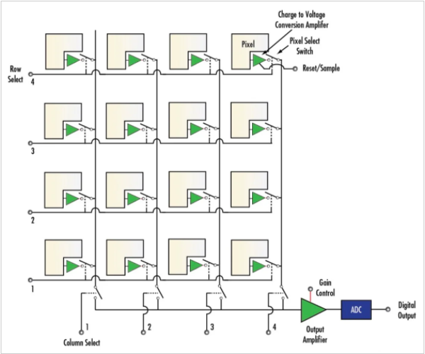 光電探測器的二維陣列用于感測入射光強度。光電探測器產生的電荷被轉換為電壓信號,并通過“行選擇”和“列選擇”開關陣列傳遞到輸出放大器。ADC用于數(shù)字化放大后的信號。