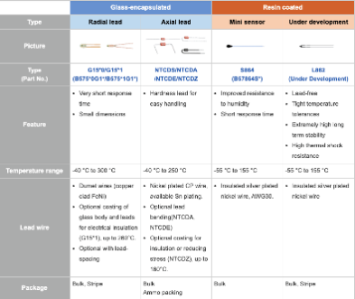 環(huán)氧樹脂涂層的NTC元件結(jié)構(gòu)堅固,測量溫度通常在-55°C至+ 155°C之間,而玻璃封裝的NTC元件的測量溫度最高可達(dá)+ 300°C。對于需要極快響應(yīng)時間的應(yīng)用,玻璃封裝的元件是更合適的選擇。它們也更緊湊,直徑小至0.8mm。