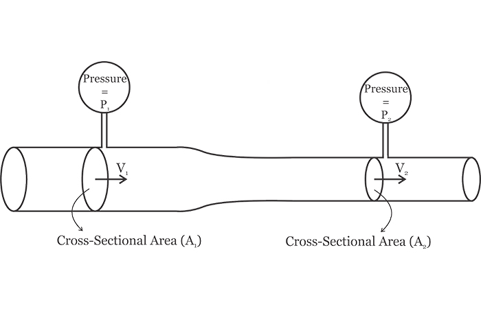 在哪里 ΔXΔt;用流體速度V代替。因此,我們可以通過(guò)簡(jiǎn)單地測(cè)量流體速度來(lái)計(jì)算流體的體積流速。可以通過(guò)將上面討論的概念應(yīng)用于具有變化的橫截面的管道來(lái)實(shí)現(xiàn)速度測(cè)量,如圖3所示。