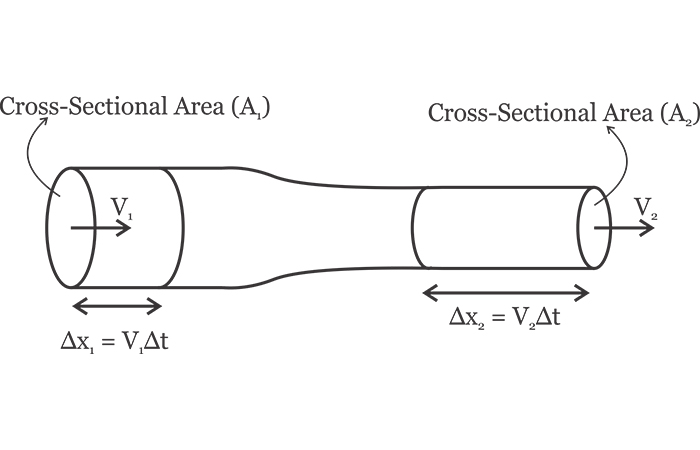 假設(shè)流體以的速度進(jìn)入管道的左端V1。超過(guò)橫截面積的流體顆粒A1 將會(huì)經(jīng)過(guò) Δx1 一小段時(shí)間后Δt。