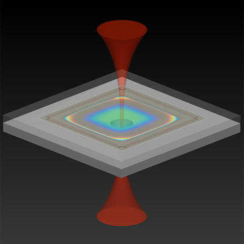 光機械加速度計的圖示,它使用光來測量加速度。NIST設備由兩個硅芯片組成,紅外激光在底部芯片進入,在頂部發(fā)射。頂部芯片包含由硅梁懸掛的標準質量塊,該質量塊使質量塊可以響應加速度自由上下移動。檢測質量上的鏡面涂層和連接到底部芯片的半球形鏡形成光學腔。選擇紅外光的波長,使其與腔體的諧振波長幾乎匹配,從而使光在離開兩個反射鏡表面之間多次來回反射時逐漸增強強度。當設備加速時,檢測質量就會移動,從而改變腔體的長度并改變共振波長。這改變了反射光的強度。光學讀數(shù)將強度的變化轉換為加速度的量度。