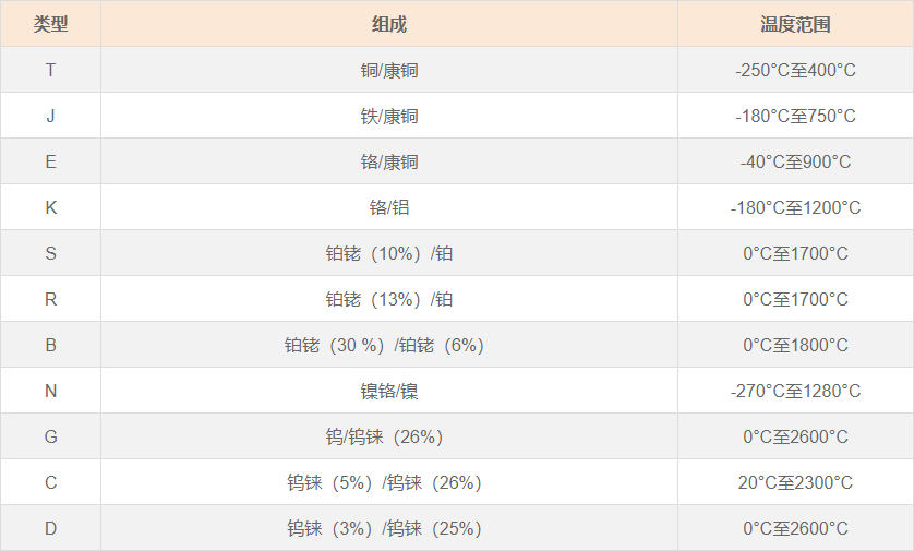 有幾種類型的熱電偶對應(yīng)于不同的金屬對。 每對金屬都有不同的測量范圍: