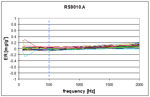 圖6: 在20 至 500Hz 和500 至 2000 Hz 頻率范圍,RS9010.A振動整流誤差 < 100 μg/g2. 此圖形由37只不同的傳感器疊加而成