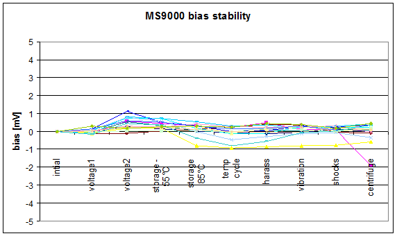 對于量程為±10g的測量,它們總的長期零偏穩(wěn)定性優(yōu)于7.5mg,對于量程±5g,優(yōu)于3.75mg,其標(biāo)度因數(shù)重復(fù)性優(yōu)于400ppm。圖1顯示了對于各種量程MS9000.D的一年零偏穩(wěn)定性的測量結(jié)果。該分析結(jié)果還包括:在85°時進行10天的加速老化實驗,這對應(yīng)于18個月的標(biāo)準(zhǔn)壽命時間,以及對加速度傳感器為期0.2毫秒,1000g的從六個方向進行的沖擊。