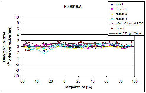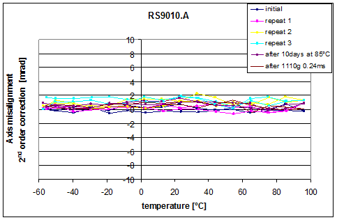圖 5: 在整個溫度范圍的軸偏穩(wěn)定性(經(jīng)過2階多項式校正之后), 沖擊和加速老化
