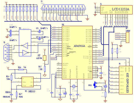 鍵盤輸入電路與LCD顯示電路實現(xiàn)人機對話的功能。RS232C接口電路與PC機的串行口聯(lián)接,實現(xiàn)通信功能。打印輸出接口電路與打印機連接,實現(xiàn)打印功能。
