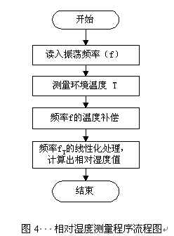 測量程序首先直接讀取當前的頻率值(f),接著測量環(huán)境溫度T,然后對頻率值(f)進行溫度補償,溫度補償后的頻率值fT = f +(25-T) ·Δf RH0· (fRH/fRH0);最后對頻率fT進行線性化處理,計算出環(huán)境的相對濕度,結束一次測量過程。