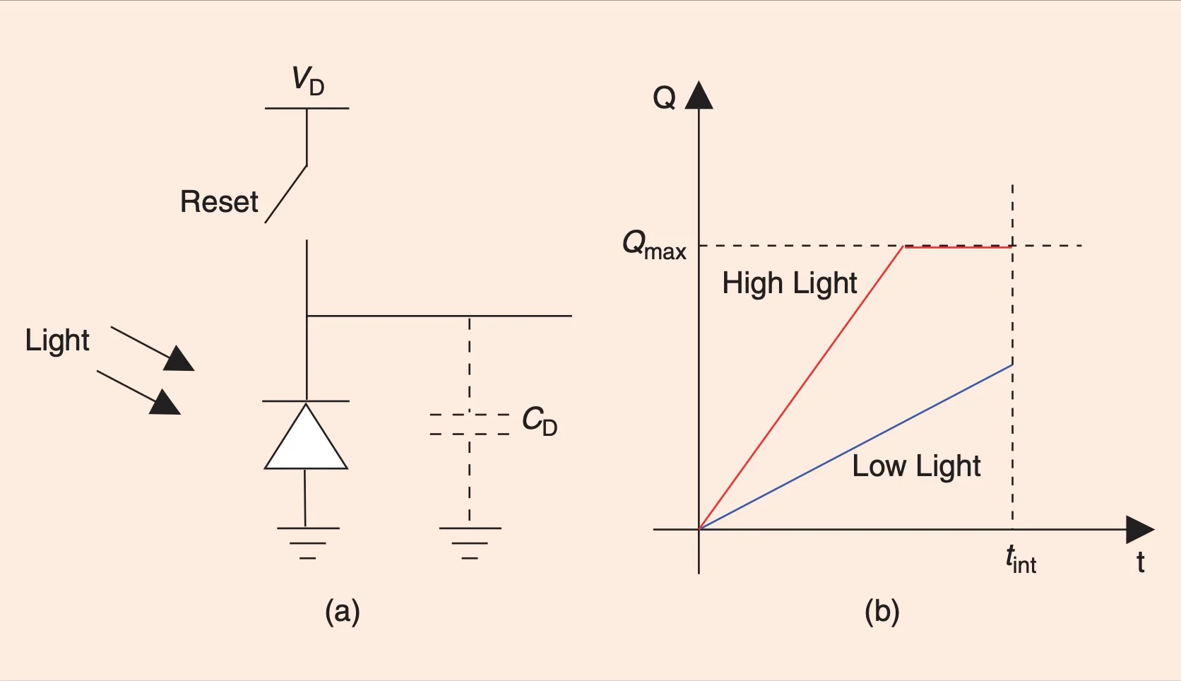 復(fù)位開關(guān)在曝光周期開始時閉合,以將光電二極管反向偏置到電壓 VD。接下來,開關(guān)打開并產(chǎn)生與入射光強度成比例的光電流。該電流在毫微微安培到微微安培范圍內(nèi),并且太小而無法直接測量。如果我們讓光電二極管暴露在光線下一段設(shè)定的時間,著色,電流將在二極管電容 CD 上積分。存儲的電荷為我們提供了更容易測量的更強的累積信號。此外,所包含的平均過程使累積的信號更忠實地表示測量的光強度,尤其是在處理微弱或嘈雜的信號時。
