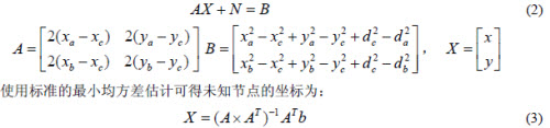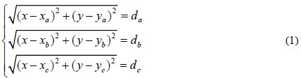 如圖1 所示,在未知節(jié)點(diǎn)獲得三個(gè)以上的信標(biāo)節(jié)點(diǎn)距離值之后,就可以通過(guò)式(1)、式(2)和式(3)計(jì)算自身坐標(biāo)。式中,(xa , ya)、(xb , yb)、(xc , yc)分別是三個(gè)信標(biāo)節(jié)點(diǎn)的坐標(biāo),da、db、dc 是未知節(jié)點(diǎn)到三個(gè)信標(biāo)節(jié)點(diǎn)的距離。