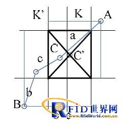 圖中A點(diǎn)和B點(diǎn)為信標(biāo)節(jié)點(diǎn),C點(diǎn)為未知節(jié)點(diǎn)。在獲得C點(diǎn)到A點(diǎn)和B點(diǎn)的折線距離a、b、c之后,在三角形ACK中,利用斜邊AC的長(zhǎng)度a代替直角邊AK的長(zhǎng)度,從而K點(diǎn)移動(dòng)到K/點(diǎn),B點(diǎn)類似,從而有: