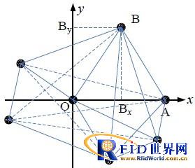 瑞士洛桑聯(lián)邦工業(yè)大學(xué)的Srdjan Capkun 等人最早針對(duì)沒(méi)有基礎(chǔ)設(shè)施的移動(dòng)無(wú)線自組網(wǎng),提出SPA(self–positioning algorithm)算法[23]。它以網(wǎng)絡(luò)中節(jié)點(diǎn)密度最大的地方選取一個(gè)參考點(diǎn)作為全局相對(duì)坐標(biāo)系的原點(diǎn),其余每個(gè)節(jié)點(diǎn)分別通過(guò)測(cè)距功能測(cè)得鄰居節(jié)點(diǎn)之間的距離值,如圖3所示,實(shí)線表示二者距離可測(cè)得,虛線表示二者不是鄰居節(jié)點(diǎn)。每個(gè)節(jié)點(diǎn)在鄰居節(jié)點(diǎn)中選取兩個(gè)點(diǎn)A、B,選取原則是這兩個(gè)點(diǎn)本身也是鄰居節(jié)點(diǎn),并且三個(gè)點(diǎn)不在同一直線上。以直線OA作為x 軸,以B點(diǎn)在OA上的投影BxB為y 軸正方向建立局部相對(duì)坐標(biāo)系。所有的局部坐標(biāo)系建立完成后,相鄰的坐標(biāo)系通過(guò)坐標(biāo)變換實(shí)現(xiàn)坐標(biāo)統(tǒng)一,最終所有節(jié)點(diǎn)都變換形成以選取的參考點(diǎn)為原點(diǎn)的坐標(biāo)系實(shí)現(xiàn)定位。由于每個(gè)節(jié)點(diǎn)都要參與多次的坐標(biāo)變換,計(jì)算量和通信開銷都非常大。此算法開始是針對(duì)無(wú)線自組網(wǎng)提出的,不太考慮功耗問(wèn)題,但是用到無(wú)線傳感器網(wǎng)絡(luò)當(dāng)中,這種通信開銷和節(jié)點(diǎn)數(shù)量呈指數(shù)比上升的算法需要根據(jù)實(shí)際情況進(jìn)行改進(jìn)。