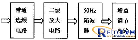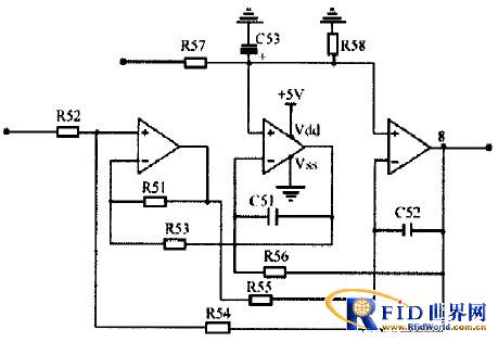 中間信號處理電路分為帶通選頻電路、二級放大電路、50Hz陷波器和增益調(diào)節(jié)電路四部分。帶通選頻電路用狀態(tài)變量濾波器作為帶通濾波器,通帶的最大范圍設(shè)定為50Hz;--"140Hz如圖3所示。這種濾波器有三個(gè)好處:適當(dāng)選擇元件數(shù)值。可使品質(zhì)因數(shù)Q和中心頻率無關(guān); 和Q對元件參數(shù)很不靈敏;Q只可以很高(可和高Q值有源帶通濾波器相媲美)。