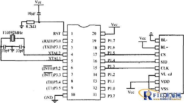 MCU采用atmel公司的AT89C205l,與液晶顯示器的連接電路如圖7所示。