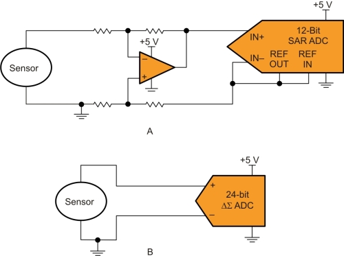 圖1.A 12位SAR(A)顯示了一個(gè)通過放大器連接至轉(zhuǎn)換器的傳感器。一個(gè)24位Δ-Σ(B)顯示了一個(gè)直接連接至轉(zhuǎn)換器的傳感器。