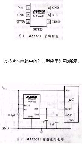 MAX6610/6611是美信公司2002年推出的一款新型模擬溫度傳感器。該傳感器內(nèi)部集成了精密的參考電壓源(VREF=4.096V/MAX6611,VREF=2.560V/MAX6610),其溫度系數(shù)小,典型值為10ppm/℃;工作電壓范圍4.5V~5.5V(MAX6611)、3.0V~5.5V(MAX6610);靜態(tài)電流小,典型值為150μA,并且自效應小,且有省電關閉控制,在關閉狀態(tài)時耗電典型值為0.2μA;測溫范圍-40℃~+125℃;測溫精度與測溫范圍有關:25℃時±1.2℃,-10℃~+55℃時±2.4℃,-20℃~+85℃時±3.7℃(保證在4σ范圍內(nèi));靈敏度16mV/℃;非線性誤差1℃。