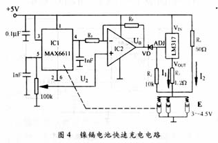 由MAX6611型溫度傳感器IC1、電壓比較器IC2、和LM317型三端可調(diào)集成穩(wěn)壓器構成的鎳鎘電池快速充電器,電路如圖4所示。該電路對3V~4.5V的鎳鎘電池組進行快速、安全地充電。通常認為,當被充電電池的溫度升高5℃時就充到額定容量的80%;此時充電器就改用40mA的小電流繼續(xù)給電池充電,這種自動切換方式不僅能節(jié)省充電時間,還不會造成過充電現(xiàn)象。