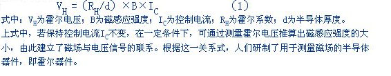 霍爾效應(yīng)是霍爾技術(shù)應(yīng)用的理論基礎(chǔ),當通有小電流的半導(dǎo)體薄片置于磁場中時,半導(dǎo)體內(nèi)的載流子受洛倫茲力的作用發(fā)生偏轉(zhuǎn),使半導(dǎo)體兩側(cè)產(chǎn)生電勢差,該電勢差即為霍爾電壓VH ,這個電壓VH與磁感應(yīng)強度B及控制電流IC成正比,經(jīng)過理論推算有如下等式關(guān)系: