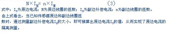 閉環(huán)霍爾電流傳感器的工作原理是磁平衡式的,即原邊電流(IN)所產(chǎn)生的磁場,通過一個副邊線圈的電流(IM)所產(chǎn)生的磁場進行補償,使霍爾器件始終處于檢測零磁通的工作狀態(tài)。當原副邊補償電流產(chǎn)生的磁場在磁芯中達到平衡時,即有如下等式: