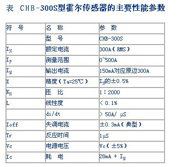 CHB-300S型閉環(huán)霍爾電流傳感器的額定電流為300A, 輸出電流為150mA,表1給出了CHB-300S型傳感器的主要性能參數(shù)。