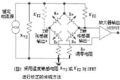 由于橋路電壓隨溫度而上升,這種溫度相關性可以用來補償滿偏輸出(FSO-Fullspanoutput)的溫度誤差。對于恒流源激勵電橋,滿偏輸出(FSO)隨著溫度上升而下降,造成了滿偏輸出的溫度相關誤差(FSOTC)。然而,如果使橋路電壓隨著溫度以一定的速率上升,恰好補償?shù)魸M偏靈敏度隨溫度的下降,則滿偏輸出(FSO)將保持恒定。