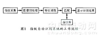 指紋識別是用取像設(shè)備讀取指紋圖像,并通過識別軟件提取指紋圖像中的特征數(shù)據(jù),然后根據(jù)匹配算法得到的結(jié)果來鑒別指紋所有人的身份,這種生物特征識別技術(shù)主要涉及指紋圖像采集、圖像預(yù)處理、特征提取、特征匹配等過程。識別時,可由計算機對預(yù)存的模板與當(dāng)前獲得的特征數(shù)據(jù)進(jìn)行比較,以計算出它們的相似程度,從而得到兩幅指紋圖像的匹配結(jié)果。指紋自動識別系統(tǒng)(AFIS)的簡單流程如圖1所示。