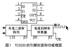 TCS230是TAOS(Texas Advanced Optoelectronic Solutions)公司推出的可編程彩色光到頻率的轉(zhuǎn)換器。它把可配置的硅光電二極管與電流頻率轉(zhuǎn)換器集成在一個單一的CMOS電路上,同時在單一芯片上還集成了紅綠藍(lán)(RGB)三種濾光器,是業(yè)界第一個有數(shù)字兼容接口的RGB彩色傳感器。TCS230的輸出信號是數(shù)字量,可以驅(qū)動標(biāo)準(zhǔn)的TTL或CMOS邏輯輸入,因此可直接與微處理器或其它邏輯電路相連接。由于輸出的是數(shù)字量,并且能夠?qū)崿F(xiàn)每個彩色信道10位以上的轉(zhuǎn)換精度,因而不再需要A/D轉(zhuǎn)換電路,使電路變得更簡單。圖1是TCS230的引腳封裝和功能框圖。