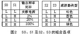 S0、S1用于選擇輸出比例因子或電源關(guān)斷模式;S2、S3用于選擇濾波器的類型;OE是頻率輸出使能引腳,可以控制輸出的狀態(tài),當(dāng)有多個芯片引腳共用微處理器的輸入引腳時,也可以作為片選信號;OUT是頻率輸出引腳,GND是芯片的接地引腳,VCC為芯片提供工作電壓。圖2是S0、S1及S2、S3的可用組合。