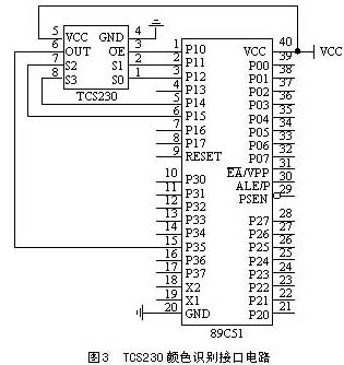 基于上述分析,采用89C51和TCS230設(shè)計了一個醫(yī)用液體顏色識別裝置。該裝置具有結(jié)構(gòu)簡單、識別精度和效率高的特點,并且能夠和上位機(jī)通信,以將識別的結(jié)果實時傳送給上位機(jī)。由于是說明TCS230的使用情況,下面僅給出其中的TCS230識別電路,如圖3所示。圖3中用89C51的P1口的幾個引腳來控制TCS230的各個控制引腳,而TCS230的輸出引腳被連接到89C51的定時器/計數(shù)器1的輸入端(P3.5)。設(shè)置89C51定時器/計數(shù)器為相應(yīng)的工作方式,初始化89C51定時器為一個定值,再選擇TCS230的輸出比例因子,并使能輸出引腳。實際使用中通過讀取89C51計數(shù)器的值,就可以分別計算出TCS230的三種輸出頻率,進(jìn)而確定R、G、B值及顏色。