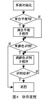 在程序流程中:系統(tǒng)初始化負(fù)責(zé)設(shè)置89C51的定時器/計數(shù)器的工作方式,選擇TCS230的輸出比例因子,使能輸出引腳以及通信參數(shù)的設(shè)置。初始化完成后,檢測是否需要進(jìn)行白平衡調(diào)整。如有,調(diào)用白平衡子程序;否則,轉(zhuǎn)到下一步,檢測是否需要進(jìn)行顏色識別。如沒有,返回;如需要顏色識別,調(diào)用顏色識別子程序,直到顏色識別完畢。