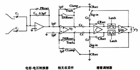 本系統(tǒng)采用帶增量調(diào)制器的電容一電壓轉(zhuǎn)換器,它能夠獲得可調(diào)節(jié)的信號(hào)帶寬和檢測精度。其電路如圖2所示。