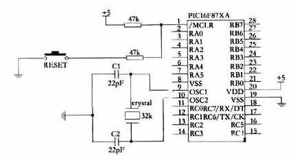 本系統(tǒng)采用PIC16F87X工作電路,如圖4所示。其中兩個(gè)47KΩ的電阻與復(fù)位鍵Reset組成復(fù)位系統(tǒng),電容C1、C2均為22pF,與32k的晶振組成振蕩系統(tǒng)電路。