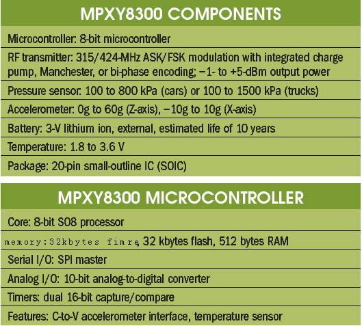 MPXY8300采用飛思卡爾的系統(tǒng)級(jí)封裝(SiP)工藝,包括一個(gè)8位微控制器,一個(gè)SmartMOS射頻發(fā)射器以及一個(gè)壓力傳感器。SiP也可以包含一個(gè)可選的單軸(Z),或者雙軸(Z加X(jué))加速計(jì),用來(lái)跟蹤轉(zhuǎn)動(dòng)及位置。隨著更多的混合技術(shù)被集合在一起,飛思卡爾因而一直致力于發(fā)展這種多芯片封裝(參見(jiàn)“Innovative Packaging Technology Aims At Miniaturized Devices”,www.electronicdesign.com, ED Online 13521)。與微控制器和加速計(jì)相比,RF發(fā)射器采用的生產(chǎn)工藝不同)。