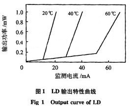 圖1是一種典型的半導(dǎo)體激光器在不同溫度下的輸出功率與正向驅(qū)動(dòng)電流的關(guān)系曲線。為了便于看清楚,圖中底部的近似直線部分有意抬高了一些。由圖1中可以看出:當(dāng)驅(qū)動(dòng)電流低于閾值時(shí),激光器只能發(fā)射出熒光,只有當(dāng)驅(qū)動(dòng)電流大于激光器的閾值電流時(shí),激光器才能正常工作發(fā)出激光,因此,要使LD發(fā)射激光,就要供給LD略大于閾值電流的工作電流。而且,LD的閾值電流受溫度的影響,溫度越高,相應(yīng)的閾值電流越大。在某一溫度下,當(dāng)驅(qū)動(dòng)電流低于閾值電流時(shí),輸出光功率近似為零;當(dāng)驅(qū)動(dòng)電流高于閾值時(shí),輸出激光,光輸出功率隨著驅(qū)動(dòng)電流的增大而迅速增加,并近似呈線性上升。