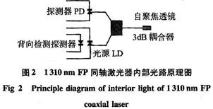 本文使用的是波長(zhǎng)為1310 nm的FP同軸激光器,其工作電流為25.0 mA,輸出功率為0.96 mW,內(nèi)部光路原理結(jié)構(gòu)如圖2所示。LD與背向檢測(cè)探測(cè)器PD組合,并封裝在一起,LD是正向接法,PD是反向接法。PD用來(lái)檢測(cè)激光器的背向輸出光功率,其輸出光功率取決于LD的輸出值。