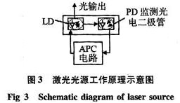 由圖3可以看出:LD與監(jiān)測(cè)二極管是集成在一起的元器件。流入LD的電流經(jīng)過(guò)APC電路的預(yù)偏置電流。APC電路通過(guò)電流負(fù)反饋電路抑制由于溫度變化、器件老化等引起的光功率的變化。APC電路部分采用背向光反饋?zhàn)詣?dòng)偏置控制方式,即用半導(dǎo)體激光器組件中的PD光電二極管監(jiān)測(cè)LD背向輸出的光功率。因?yàn)楸诚蜉敵龉夤β誓芨櫱跋蜉敵龉夤β实淖兓,通過(guò)閉環(huán)控制系統(tǒng)就可以調(diào)節(jié)激光器的電流,達(dá)到輸出穩(wěn)定光功率的目的。