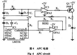 圖4所示的APC電路由運(yùn)算放大器1,2和晶體管Q1以及外圍電路組成,該電路是一個(gè)以三極管為核心的負(fù)反饋系統(tǒng),具有自動(dòng)穩(wěn)定激光器光輸出功率的功能。反饋取自LD的背向光,由背向光監(jiān)測(cè)二極管檢出并轉(zhuǎn)換成相應(yīng)的電流,經(jīng)電容器C1濾波后,進(jìn)入運(yùn)放的反向輸入端,將電流信號(hào)轉(zhuǎn)換成電壓信號(hào)V1。運(yùn)放的同向輸入端由LM336和運(yùn)放組成的+2.5 V穩(wěn)定基準(zhǔn)源及變位器R5組成。基準(zhǔn)電壓的輸出為V2,可以通過(guò)變位器進(jìn)行調(diào)節(jié)。