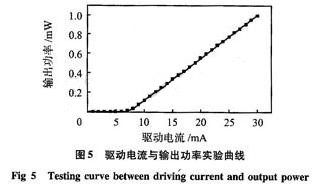 根據(jù)本傳感器的激光器的性能參數(shù),選擇合適的電阻電容進(jìn)行匹配,調(diào)節(jié)電位器,可以得到不同的光功率輸出值。圖5是在室溫(25℃)下進(jìn)行的實(shí)驗(yàn)曲線圖,從圖中可以看出:該光纖傳感器LD光源的閾值電流在8 mA左右,穩(wěn)定工作在10~30mA之間。輸出功率與驅(qū)動(dòng)電流在大于閾值電流后呈較好的線性關(guān)系。正常工作時(shí)能輸出-0.1,-1,-2,-5,-10 dB等可調(diào)的穩(wěn)定的光功率值。電路中的參數(shù)配置,使流入LD的電流不會(huì)超過(guò)其極限值。