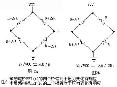 PRT一般配置為一個(gè)緊密的惠斯登電橋。當(dāng)有壓力施加到PRT的敏感電橋時(shí)(見圖2a所示),對(duì)角橋臂的電阻值將發(fā)生相同方向、相同大小的改變。當(dāng)一個(gè)對(duì)角橋臂上的兩個(gè)電阻值在壓力的作用下增加時(shí),另外一個(gè)對(duì)角橋臂的電阻值降低,反之亦然。對(duì)于半敏感電橋PRT(見圖2b所示),則只有半邊橋臂的電阻值發(fā)生改革。不管是全橋還是半敏感電橋的PRT傳感器都具有高靈敏度(>10mv/v)、良好的線性和溫度穩(wěn)定性、無信號(hào)滯回等優(yōu)點(diǎn),其測(cè)量范圍可上至破壞性極限。