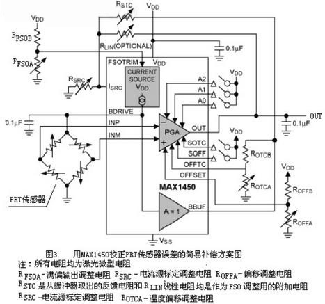 MAX1450信號(hào)調(diào)理器(見圖3所示)的功能本質(zhì)與MAX1457相同,只是用電阻代替DAC來進(jìn)行誤差校正。因MAX1450采用MAX1457比少得多的校準(zhǔn)點(diǎn),其精度為1%。通常被用于混合方案,該方案將MAX1450和繳光微調(diào)電阻(所有外接電阻)相結(jié)合提供了一種低成本的解決方案, 即用MAX1450信號(hào)調(diào)理器配合外部激光微調(diào)電阻可提供1%精度。調(diào)整RFSOA電阻是設(shè)定初始(FSO)靈敏度,溫度偏差的調(diào)整是通過反饋傳感器驅(qū)動(dòng)電后電壓(來自BDRIVE引腳)來實(shí)現(xiàn),由PGA程控放大器來完成偏差的補(bǔ)償。