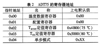 ADl75包含5個寄存器:4個數(shù)據(jù)寄存器和1個地址指針寄存器。配置寄存器是惟一的8位數(shù)據(jù)寄存器,其余的均是16位。溫度數(shù)據(jù)寄存器是惟一的只讀數(shù)據(jù)寄存器。上電時,地址指針寄存器被設(shè)置為Ox00,且指針指向溫度數(shù)據(jù)寄存器,具體描述見表2。