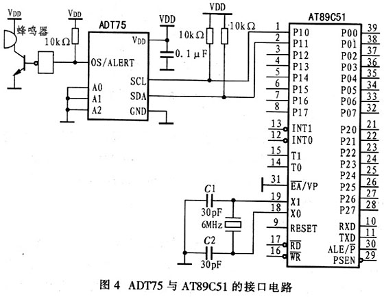 在直冷式電冰柜溫度測控系統(tǒng)的設(shè)計(jì)中,以AT89C51型單片機(jī)為核心,采用ADT75構(gòu)成溫度控制電路。這種電路硬件設(shè)計(jì)簡單且功耗較低,實(shí)用性強(qiáng)。ADT75與AT89C51的硬件接口電路如圖4所示。